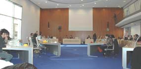 -Links: Een groepsfoto bgv de ontmoeting in het Bestuurscentrum. -Onder: Indrukken van de raadzaal. |
