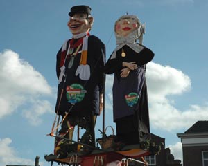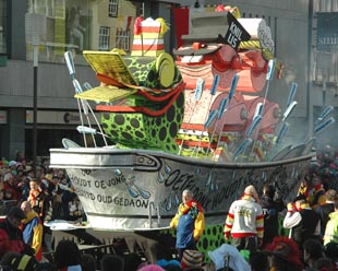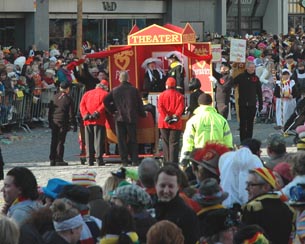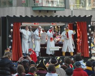 ![]() | -Links: De Zône van ons moeder' met o.a. Hans Tervoort in een PAUS[E] setting. Erbij stond: 'Houdt oew jong bij oe..'.[10e plaats] -Hieronder: De Rare Schutters vroegen zich af: 'Theater aan..? en : 'Wè un poppekast !' [7e plaats] |