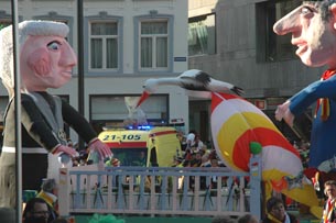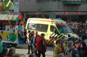 | -Boven: Een ambulance ging rond 4 uur dwars door het publiek en de stoet om bij een melding op de Markt te kunnen komen. -Rechts: Knillis en Moeder Hendrien kijken het met lede ogen aan. foto's © paul kriele, 20 februari 2012. | ![]() |