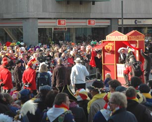 | -Boven: 'Het Vervolg' met een kort toneelstukje over het theater. Daar mocht ook burgemeester Rombouts even in de fauteuils naar kijken. -Rechts: De Jutters. ' Oeteldonk is overal theater. Ontwerp Peter Verboven. foto's © paul kriele, 20 februari 2012. | ![]() |