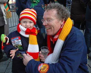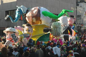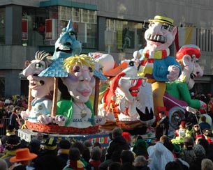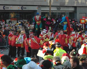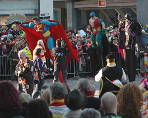 | -Rechts: Enkele supermannen gaven een show weg. -Onder: Oeteldonk blijft met bewegingen jong, zeggen De Tierelantijnen. Maar ook de politieke boodschap over het puthuis en met name de glazen afdekplaat. Drie wethouders en een fractieleider hebben zich er al op stuk gebeten. Dat blijkt uit de uitmonstering van De Tierelantijnen met hun glazen plaat voor het puthuis en met de figuren Paul van der Krabben, Jan Hoskam, Jetty Eugster en Bart Eigeman. Ontwerp Ronnie Meijer. [2e plaats] | ![]() |