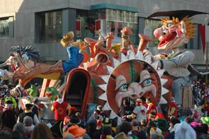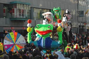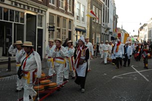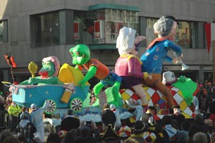 ![]() | Grote loopgroep De Pinkvatters met een deelname onder de woordspeling 'Doorgestoken Kaas?'Opname op de Pensmarkt [l.] en in de Verwersstraat [boven]. Eigen ontwerp. Met 'Belegen jong en oud' namen zij de proef op de som. Ook de jeugdprins moest er aan geloven. [3e plaats] foto 's © paul kriele, 20 februari 2012. |