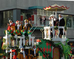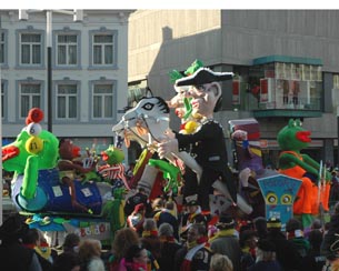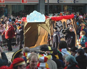 | -Boven: Deze tijdmachine is gebouwd voor Nooit Op Tijd Thuis [N.O.T.T.] door een professor. Daarmee word je binnen een minuut elf jaar jonger. Dat moest ook burgemeester Rombouts meemaken. Via het luik links naar binnen. Rombouts kwam er verkleed als een baby uit... N.O.T.T.]: 'Binnen een minuut 11, elf jaar jonger.'.. Ontwerp Stephan Heesbeen. [ 1e plaats]. Rechts: Prins Amadeiro XXV en diens adjudant sloten al wuivend naar de massa's mensen- tenminste op de Markt en de direct omliggende straten -de optocht af. foto's © paul kriele, 20 februari 2012. | ![]() |