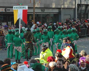 | -Boven: Club Attennooije. Door de bezuinigingen moet ook Defensie inkrimpen. Onder aanvoering van een sergeant - D'n Drilkikker -moet dit batlajon soldaten gedrild worden. Het zag er spectaculair en amusant uit. Ontwerp Marcel van' wam ism de op optochtcommissie SMO 'Attenooije!' [1e plaats] foto's © paul kriele, 20 februari2012. | ![]() |