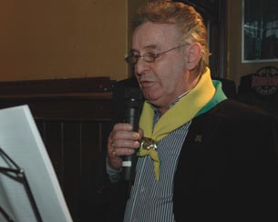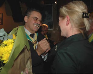 -Boven: De voorzitter van De Kikvorschen, Bertie van den Heuvel, uit eigen ervaring erg betrokken bij de ziekte kanker, benadrukte geëmotioneerd de grote verdiensten van de talrijke vrijwilligers van het Vicky Brownhuis. -Links boven: Het moment waarop Christine Veldhuizen de zilveren Moeder Truus Poffer ontvangt. -Links: Dankwoord van de gedecoreerde bestuursvoorzitter van het Vicky Brownhuis Christine Veldhuizen voor de genodigden in 't Pumpke aan de Parade. foto's © paul kriele, 22 februari 2012. |
