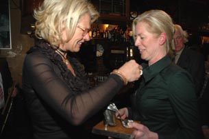 Véronique Bosmans-Renders [l.] spelt bij voorzitter Christine Veldhuizen de zilveren replica van de Moeder Truus Poffer op. |