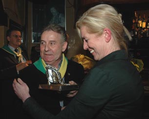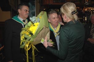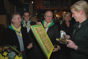 | Gelukwensen en bloemen voor Christine Veldhuizen. Links Hans Bosmans en middenin Bertie van den Heuvel. | Peter van den Groenendaal van 't Pumpke overhandigt de oorkonde behorend bij de onderscheiding. |