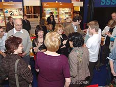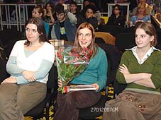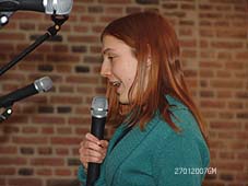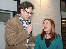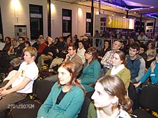 -Links boven: deelnemer Kaarina Schoonheim -Boven:de zaal van de Openbare Bibliotheek met 60 bezoekers. -Presentator Henk Langenhuijs met de winnares Veerle Vrindts uit Leuven. [ook onder]. -Links onder;.Muziek van de The Practicles. |