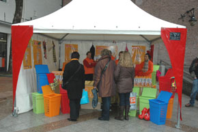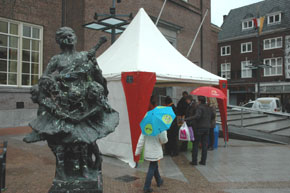 | De belangstelling was redelijk. Er lag een hoopje kleding in de stand op het Kerkplein van wasmiddelenfabrikant Robijn. | foto © paul kriele, 6 februari 2008. |