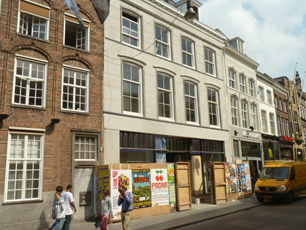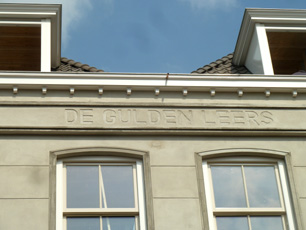 | -Links boven: Het indrukwekkend interieur is gesteld in de kleuren zwart, paars/blauw en grijs. Rechts achterin bevindt zich de roltrap naar de eerste etage. De overige verdiepingen zijn ingericht als appartement. -Rechts de daklijst met daaronder de naamgeving die herinnert aan een van de twee panden die op deze plek hebben gestaan. Boven de winkel bevinden zich 3 appartementen, waarvan de ingang aan Achter deTolbrug zit. foto's © paul kriele, 1 mei 2012. | ![]() |