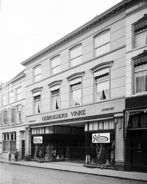 | Hooge Steenweg 23/25: De klassieke gevel van eerder twee samengevoegde panden. De stijl herinnert aan de tijd van het modehuis Vinke uit de jaren 30. De architect is VOCUS olv directeur Bob Custers. | Situatie van het modehuis in de jaren 30, , toen Gebroeders Vinke. foto © paul kriele, 1 mei 2012 en rechts archieffoto. |