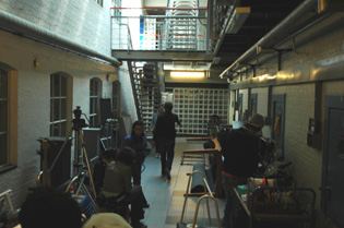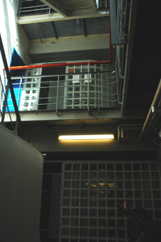 | Het cellenblok [l.] en het trappenhuis van de gevangenisvleugel die geen Monumentenstatus heeft. | foto's © paul kriele, 4 mei 2001. |