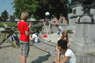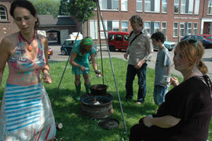 | -Boven: Onder het loof van het Emmaplein serveert Els van Olphen van productiebedrijf Henri pommodorisoep, gemaakt van natuurlijke bestanddelen. 'Soep,' zegt Els, 'is eten en eten is ook beleving' en het is ook nog eens puur natuur..'! -Rechts: Camille de Bont en Femke Lamers van de Beekmanschool,maakten aan de voet van het H.Hartmonument een variant op 'zon, zee en strand'. foto's © paul kriele, 24 mei 2012. |