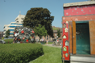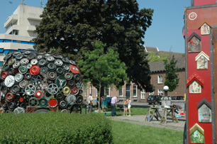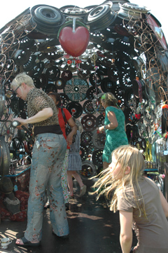 -Boven: Op donderdag 24 mei stonden de kathedralen op het Emmaplein. Het interieur [rechts] van een van de kathedralen met initiatiefneemster Imke van Dillen [rechts achter] . -Rechts een kathedraal behangen met wieldoppen. foto's © paul kriele, 24 mei 2012. |