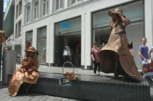 | De beelden trokken vaak ook kinderen aan, maar die waren meestal wel wat terughoodend. Zodra er een muntje in het bakkie viel begon er iets te bewegen of werd er een wiel of een machine in gang gezet. Niet alleen volwassenen, ook kinderen deden dit keer mee aan het festival zoals rechts Romy [l.] en Linsdy uit Lommel met het thema 'The Ladies on the Catwalk'. fotos © paul kriele,1 juli 2012. |