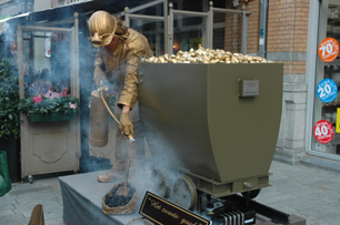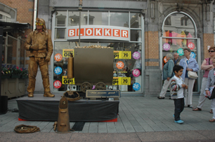-Boven: De vuurkist van een stoommachine, die compleet met rook en dampend geluid, aanwezig is op de Hinthamerpromenade. -Rechts: 'Guus de ramenwasser' op het Kerkplein die pas actief wordt als ie geld vangt... foto's © paul kriele, 1 juli 2012. |