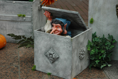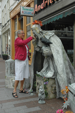 -Boven: Fonteinplein. Gobelinck de sprookjesbewaker met vogelgeluid, onweer en een heks die te voorschijn komt. Rondom hem heen staan sprookjes uitgebeeld: o.a. een giftige appel, de tovwrfluit, de schtakist en een toverspiegel. -Links: Op Achtet het Stadhuis staat deze dame [Afke Westdijk] die pas begint te fietsen als er iets in haar mandje valt.... foto's © paul kriele, 1 juli 2012. |