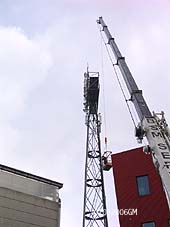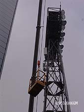 | Het aanbrengen van steunzenders voor mobiel netverkeer aan de lichtmasten van het stadion. foto's © gerard monté, 2 maart 2006. |
