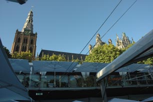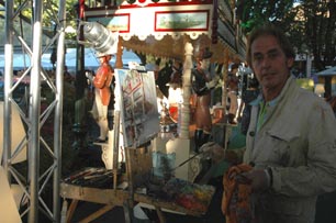 | Sfeerbeelden van Bourgondisch 's-Hertogenbosch 2012, links Coquile tegen een silhouet van de kathedraal. | Kunstenaar Rob Jacobs schildert de ijskar van De Rul. foto's © paul kriele, 7 september 2012. |