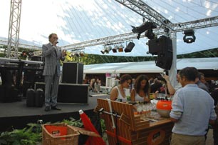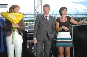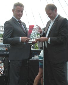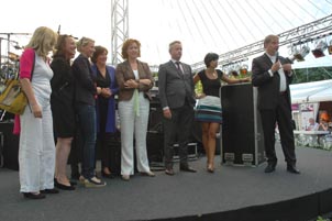 -Boven: Wethouder Jan Hoskam reikt aan de locatiemanager van Möwenpick Den Bosch Wim van der Steen, de oorkonde en het 'Meest Gastvrije ondernemersymbool' uit. Links boven en links: De genomineerden vlnr. het team van TheateradParade, midden Wim van der Steen [Möwenpick] en Claudia Zanin van Italiëpunt. foto's © paul kriele, 7 september 2012. |