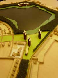 Bouwmaquette Zicht vanaf het westen[Van Lanschotlaan] op het HAS-terrein. Daarachter de plas en -midden-daarachter de verzamelde lagere bouw op de Brabantbadlocatie [parkeerterrein]. |