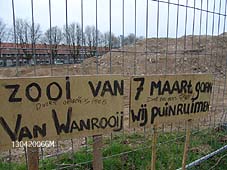 | Op de borden van de rechter foto staat : Zooi van Van Wanrooij en daaronder Duurt verrekes lang [linker bord]. En op het rechter bord: 7 maart gaan wij puinruimen. Doet nou eens FORT. | foto's © gerard monté, 13 april 2006. |