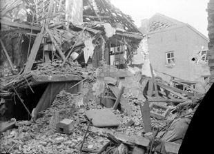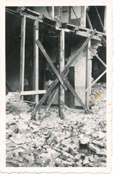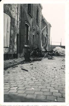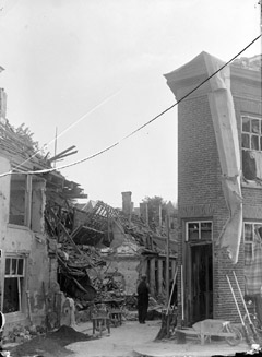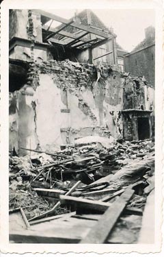 | De rechter foto is in de richting van de Zuidwal genomen. Het verbrande huisraad ligt nog op de stoep. foto's van juli 1940, gemaakt waarschijnlijk door Muijtjens die lid was van de Luchtbescherming. |