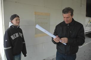 | -Boven: De architect van het paviljoen Jeroen van de Ven en diens zoon Mic plakken de eerste steen af voorafgaand aan de officiële ceremonie. . -Rechts: Ook de uitvoerder Theo Verhoef van Bouwbedrijf Van den Bouwhuijssen was aanwezig. foto's © paul kriele, 27 oktober 2012. |