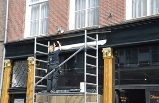 | De nieuwe juwelierszaak van Van Amelsfoort op Vughterstraat 69, waar Marieke van de Wouw in gouden en zilveren letters de naam van de zaak op de winkelpui aanbrengt.. |