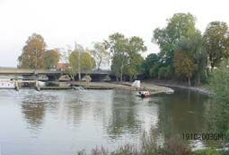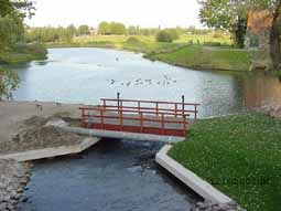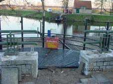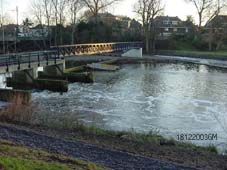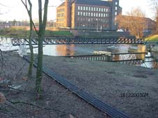 | Gezicht vanaf de Vughterbrug op het eiland [achterin de PNEM] . Duidelijk zijn hier het looppad [Essentpromenade] en de brug over de Vughterstuw te zien. | De loopbrug over de stuw in beeld. |