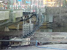 Rechts gezicht op het eiland vanaf de wenteltrap en links de wenteltrap aan de Vughterbrug.