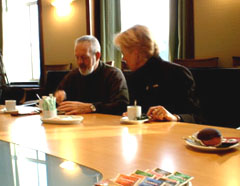| -Boven: Ivonne ter Heine van Vughterweg 2, in gesprek met de eilandverzorger Janus van Vugt. -Rechts [boven]: Het bruggetje vanaf het privé-terrein Vughterweg 2 naar het eiland. rechter foto's © gerard monté, 18 december 2003. foto boven © paul kriele, 19 december 2003. |