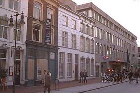 ![]() | De Kerkstraat zuidzijde, ofwel de oneven nummers: het donker grijze pand van links gezien, heet het Fransch Kabinet dat momenteel wordt gerestaureerd. Op de bovenverdiepingen komen twee appartementen. Op het achterterrein stond de Latijnse school waar Desiderius Erasmus rond 1485 school ging. foto © gerard monté, mei 2000. |