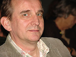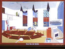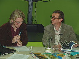 -Boven: Alex de Vries voormalig directeur Bossche KunstAkademie. -Rechts boven: Rede über die Sintflut van Thomas Huber. -Rechts: Florette Dijkstra in haar interview met De Vries. foto's © gerard monté, 15 november 2007 |