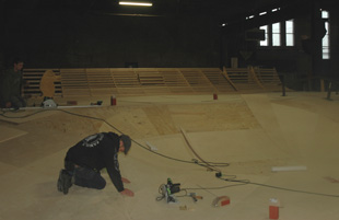 -Boven: De ingang van het nieuwe Skate Center waarachter meteen een unieke 4 m hoge pipe wordt gebouwd. -Links: Het parcours met ramps en wallride. De tribune bevindt zich achter de wallride [linkerfoto]. Kantoren en café komen in de linker zijhal.* foto's © paul kriele, 4 januari 2013. |