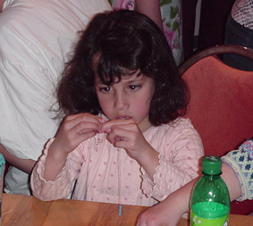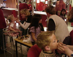Links: Een sminktafereel. Rechts: Een kralenrijgster en... veel pubkliek was er op de Internationale Kinderspeeldag afgekomen. foto' s © gerard monté en paul kriele, 21 april 2002. |
