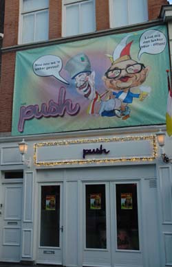 Gaycafé Push in de Postelstraat zorgde deze week voor commotie door een spandoek op de gevel met daarop twee carnavalasprominenten die volgens de buren ongewelvoegelijke handelingen verrichtten. De opgetrommelde gemeenteambtenaren concludeerden dinsdag 5 februari 2013 dat het tafereel- volgens de APV [politieverordening]- van een onzedig gedrag getuigt. Daarop ging er een gemeentelijk verzoek naar het adres van Push.