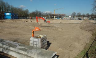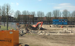 | De noordelijke kop van het bouwterrein bij de IJzeren Vrouw. Op de achtergrond loopt de Geldersedam. foto's © paul kriele,18 maart 2013. | Vanuit dit punt bij het Prins Hendrikpark is ook de nieuwbouw van de BBS-West aan de Antoon DerKinderenlaan** te zien. |
