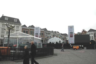 | Het grote podium en de studio´s op de Markt door de dj´s die het festival ´dragen´. | foto´s ¢ paul kriele, 29 maart 2013. |