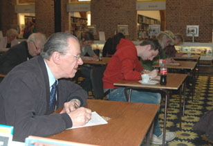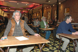 Indruk van het Grôôt Bosch Dictee op 10 april 2013 in de StadsBieb. -Hierboven: Vooraan Vincent Verstappen en Ans van Dartel, die de tekst voorlas en achterin Frank Finkers, die de tekst componeerde. -Linker foto : Vooraan Guus Ong bij het debutanten dictee en onderste foto: Daan Gielen en Cor Versteeg bij de gevorderden. foto´s © paul kriele, 10 april 2013. |