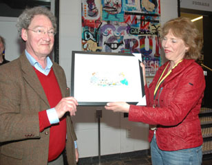 | Juryvoorzitter Nort lammers, die zelf in eerdere edities vaak als eerste eindigde, feliciteert Wilma van Dartel met haar score. | Vincent Verstappen, voorzitter van De Boschboom, overhandigt de winnares een ingelijste cartoon van Guus Ong. foto´s © paul kriele, 10 april 2013. |