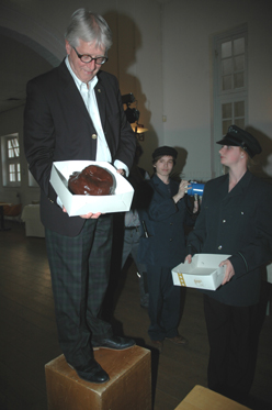 | Studenten van het KW1- College boden na een ´onthutsende´ arrestatie van Free de vertrekkende algemeen directeur, die op 20 juni van het KW1/C afscheid neemt, alvast een grote Bossche bol aan. foto´s © paul kriele, 25 april 2013. |