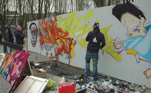 | Patrick de Kaste uit Den Bosch en Jan-Henk van Ieperen zijn hier bezig tijdens Warchild op 29 maart j.l. op de Parade. Daar maakten zij alvast reclame voor het aanstaande Kings of Colorfestival in Boschveld. foto's © paul kriele, 29 maart 2013.[r.] |