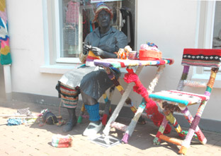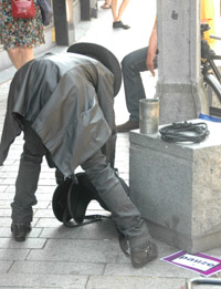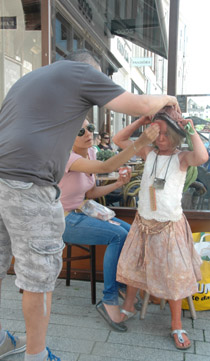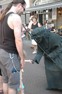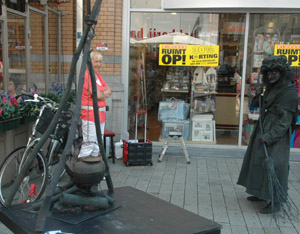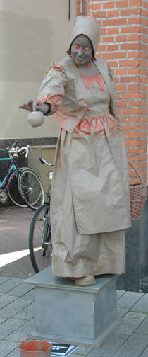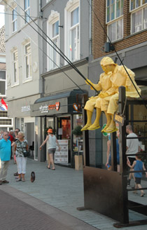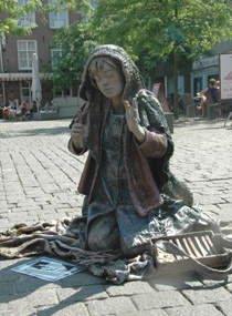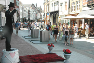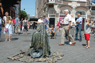 | -Boven: Er was veel publiek op deze zomerse koopzondag in de stad. Kerkstraat: Charlie Chaplin met 'Just say Yes'. en 'Het meisje met de zwavelstokjes' op de Markt -Rechts: Onderste boven op de Schapenmarkt. Hieronder links: Zwerver op de Schapenmarkt en rechts onder: Net teruggekeerd. van 'even pauze'. foto's © paul kriele, 7 juli 2013. |