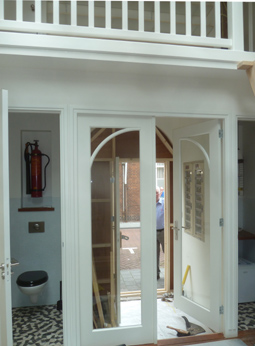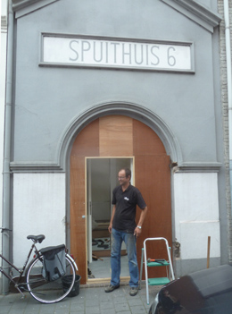 | Jeroen van der Sijs kan trots zijn op zijn karwei: een compleet ingericht kantoor met toilet en keukentje in het 'Spuithuis 6' in de St.Jorrisstraat. | Smidje Ad van de Wiel - een goede tachtiger -komt de klussende buurman 'te hulp' met een hamer van heb ik jou daar.... . |