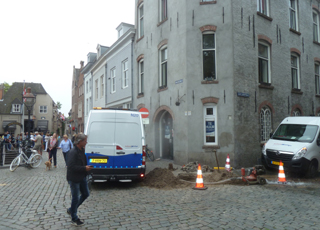 Medewerkers van Brabant Water zijn vrijdag 23 en zaterdag 24 augustus de hele dag bezig geweest een storing in de waterleiding in de Korenbrugstraat te verhelpen. De buurt had er last van en de toeristen overlast. foto © paul kriele, 24 augustus 2013. |