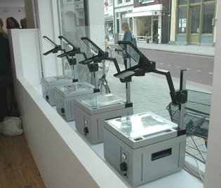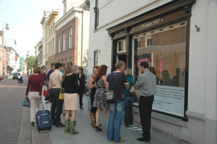 | 29 augustus 2013: Drukte rond Hinthamerstraat 147 bij de opening van de creatieve ideeënwinkel. | De sheets met een idee worden in de etalage geprojecteerd. foto's © paul kriele, 29 augustus 2013. |