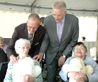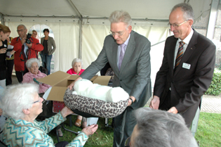 Daarop werd na een inleidend woordje door manager Zorg Hans van Venrooy het cadeau door de wethouder aan een van de bewoonsters overhandigd. Mevrouw C.J. de Kort was degene die het geschenk –een troetel zeehondje- mocht aanpakken.