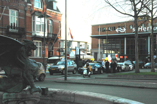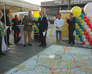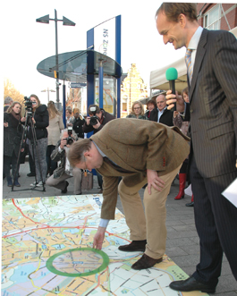 -Onder: De locatie van de zonetaxistandplaats voor het station op de plek van voorheen de treintaxi. -Links: De start van de zonetaxi. Wethouder Jan Hoskam legt achterenvolgens drie ringen, die de drie respectievelijke zones aangeven. foto's © paul kriele, 16 december 2013. |