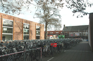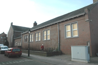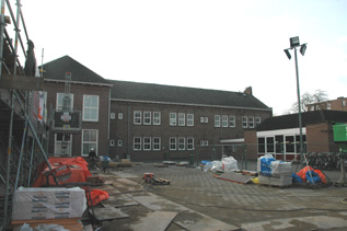 | Schoolplein met zicht op achterzijde van het oorspronkelijke lagere schoolgebouw. Links op de foto, nog net zichtbaar, de oude gymzaal [ook op rechter foto] aan de Jacob van Oudenhovenstraat, die tot aula wordt verbouwd. |